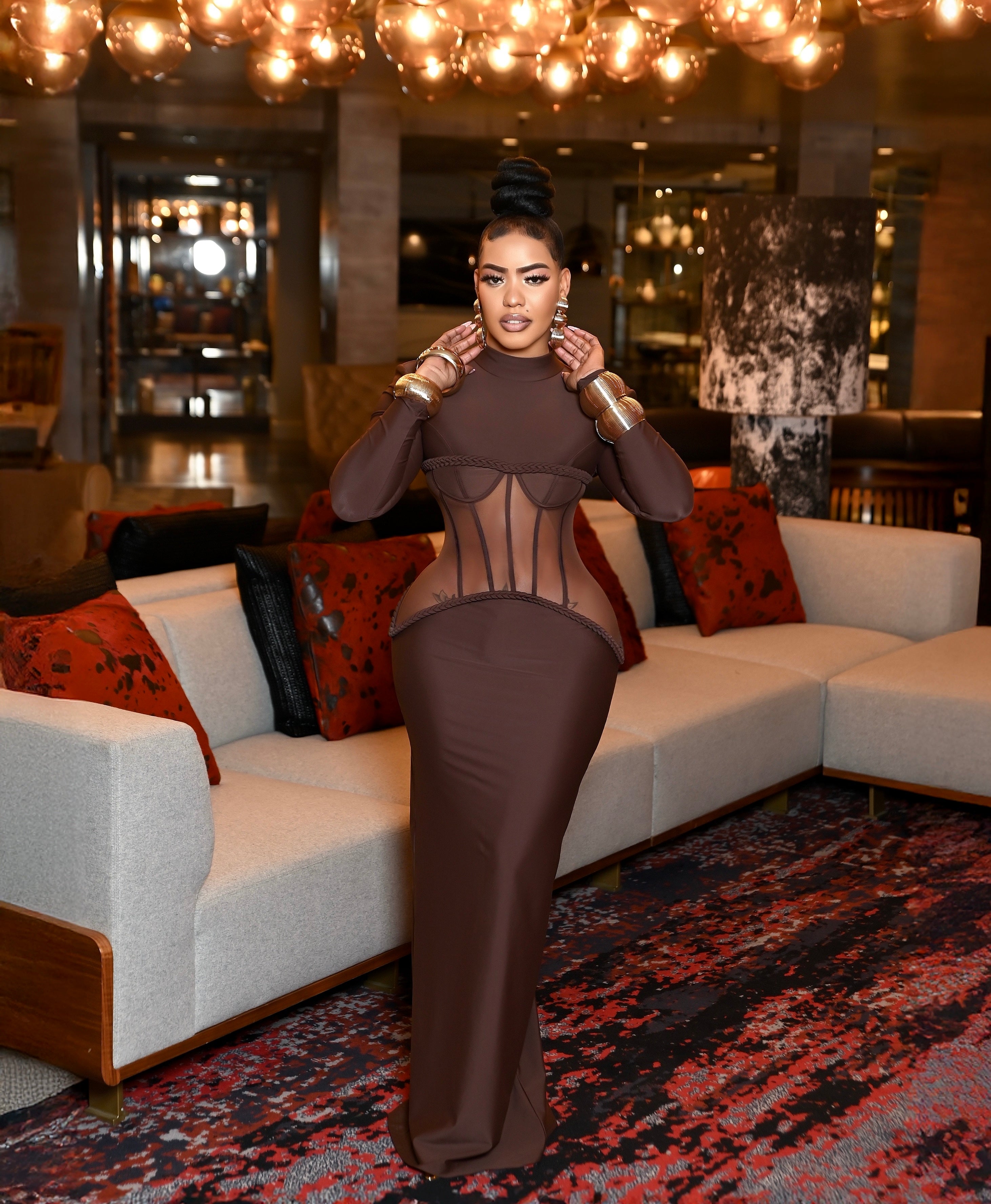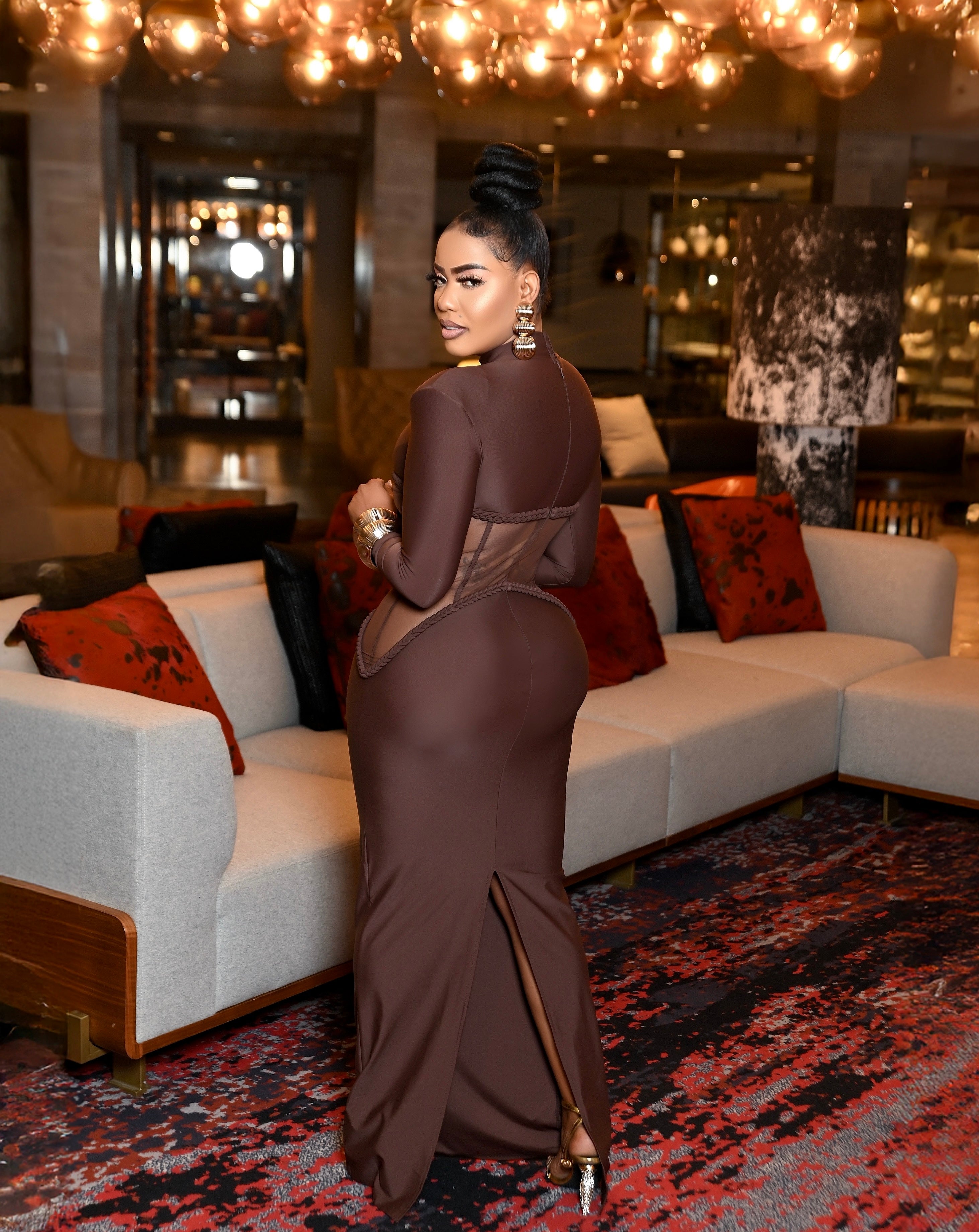 Long Sleeve Structured Mesh Maxi Bandage Dress Brown