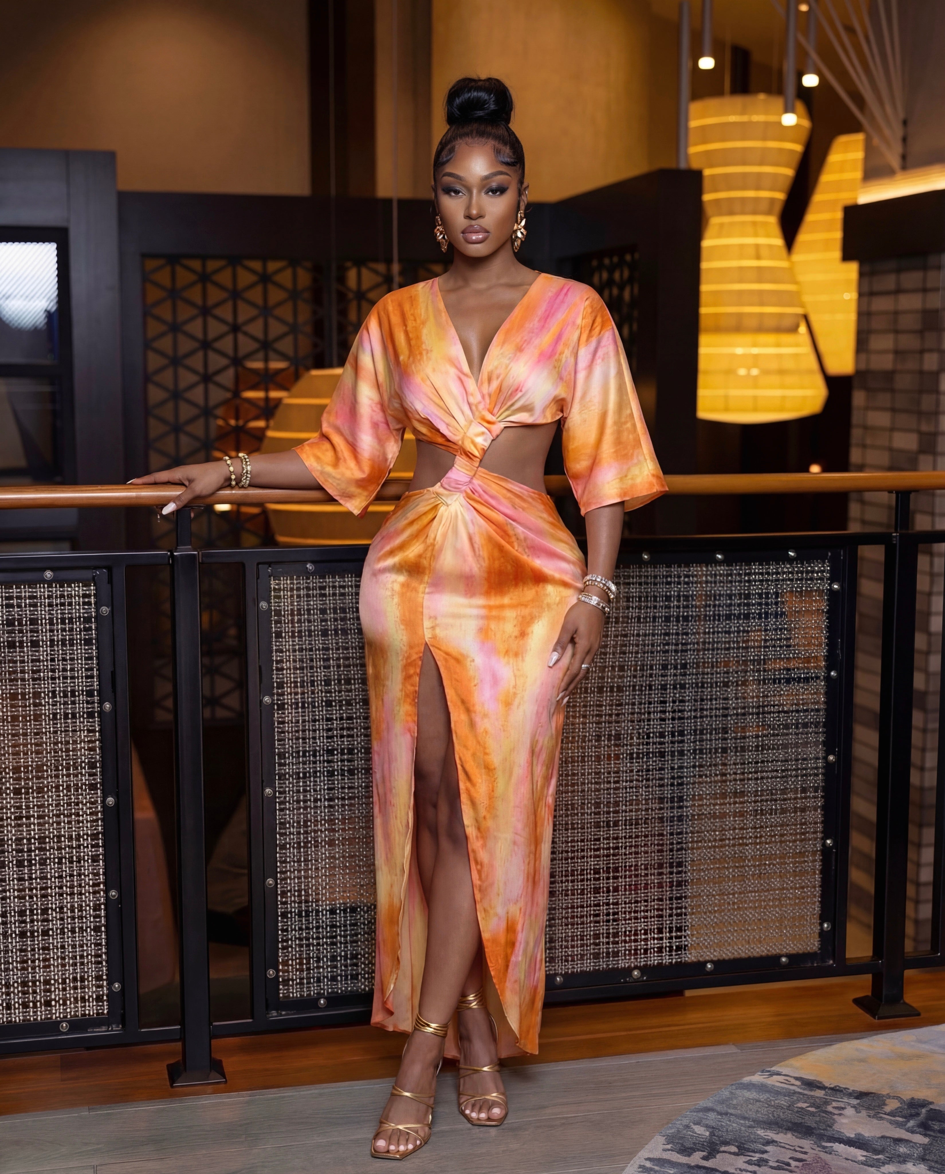 Made for the bold, confident, and effortlessly stylish woman, the Golden Hour Cutout Maxi is where elegance meets attitude. Designed in a soft, satin-feel fabric, this statement piece features a flattering twist-front detail, waist cutouts, and a flowy maxi silhouette that moves beautifully with every step. The warm sunset inspired tones bring a radiant glow that turns heads day or night.
