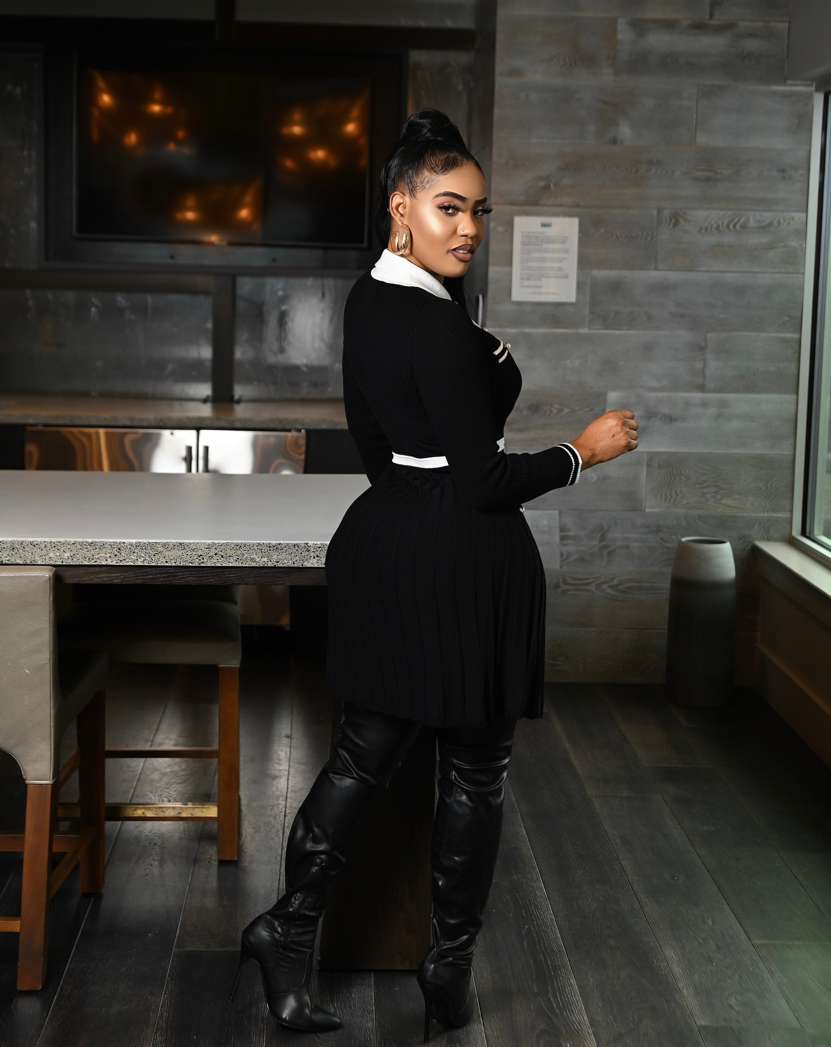 Novellea featuring a color-blocked slim-fit knitted dress with seven-quarter sleeves — a perfect blend of contemporary style and effortless elegance. The Novellea Dress captures the essence of modern casual sophistication, designed for the woman who values comfort and fashion in equal measure.