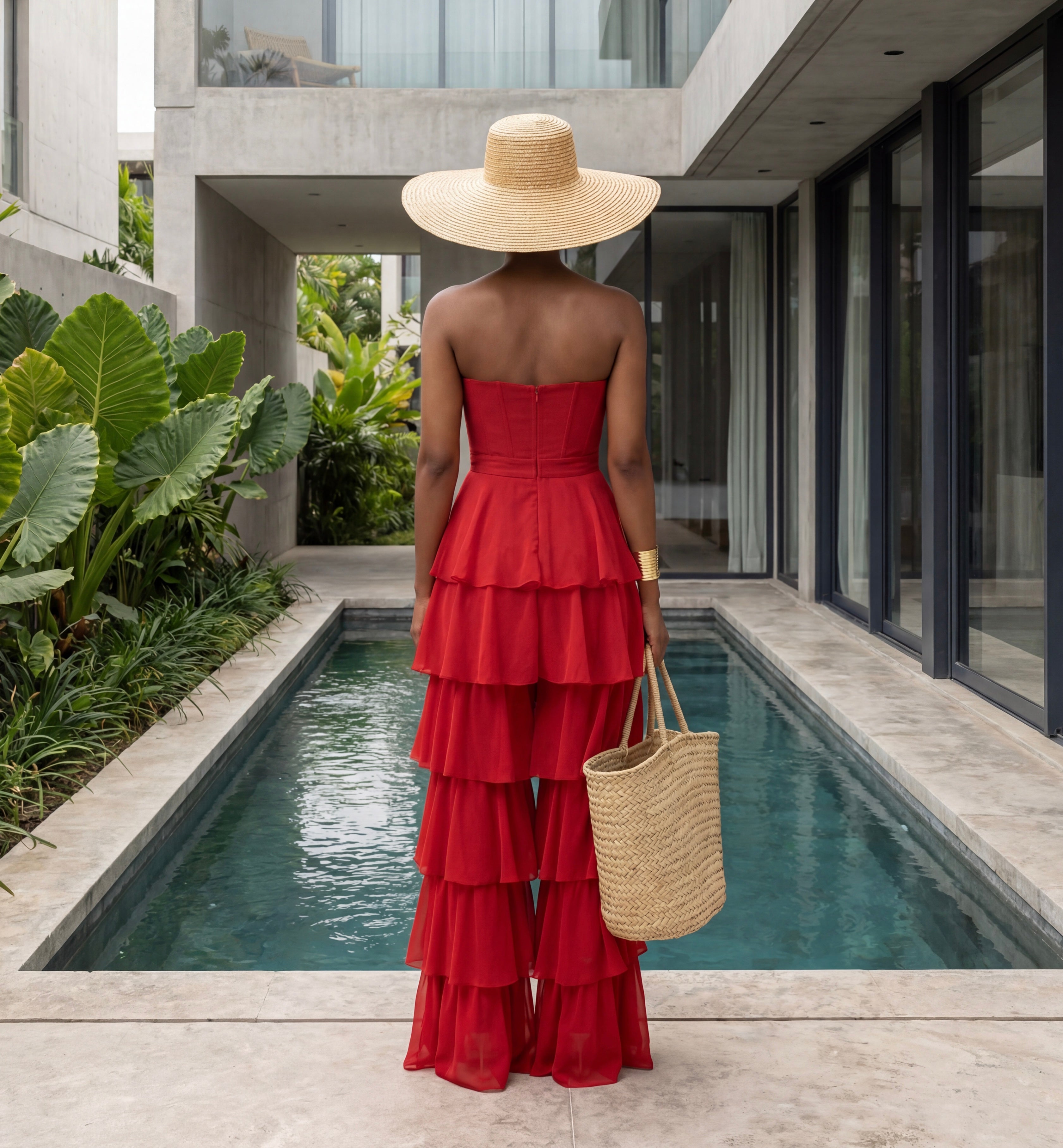 Turn heads in our Riviera Tiered Jumpsuit, a striking statement piece designed for the woman who isn’t afraid to stand out. Featuring a structured sweetheart neckline with a sleek tube-style bodice, this jumpsuit beautifully highlights the shoulders while offering a flattering, feminine shape. The layered ruffle design adds graceful movement with every step, while the wide-leg pants create an effortlessly elegant silhouette that elongates the frame.