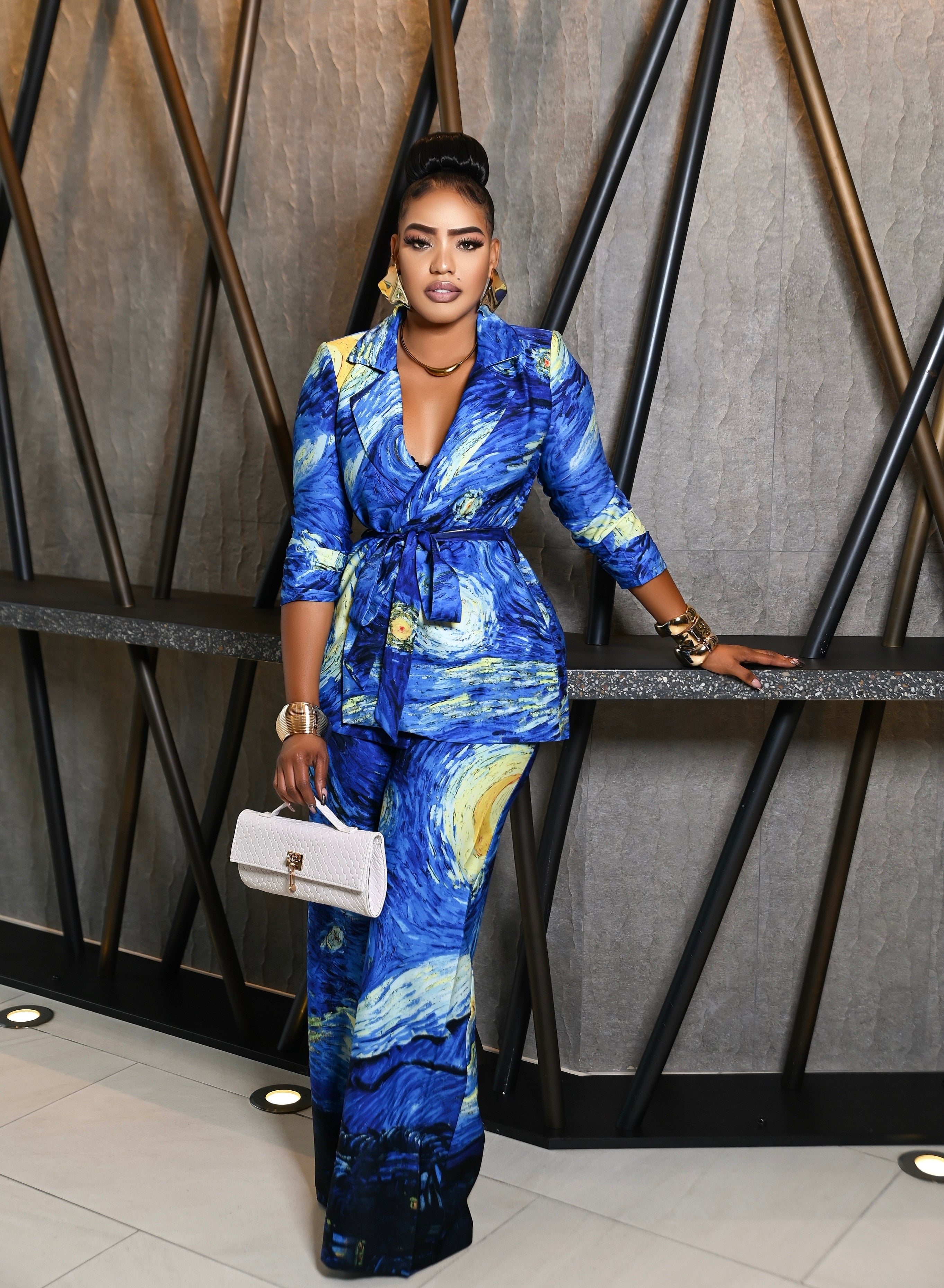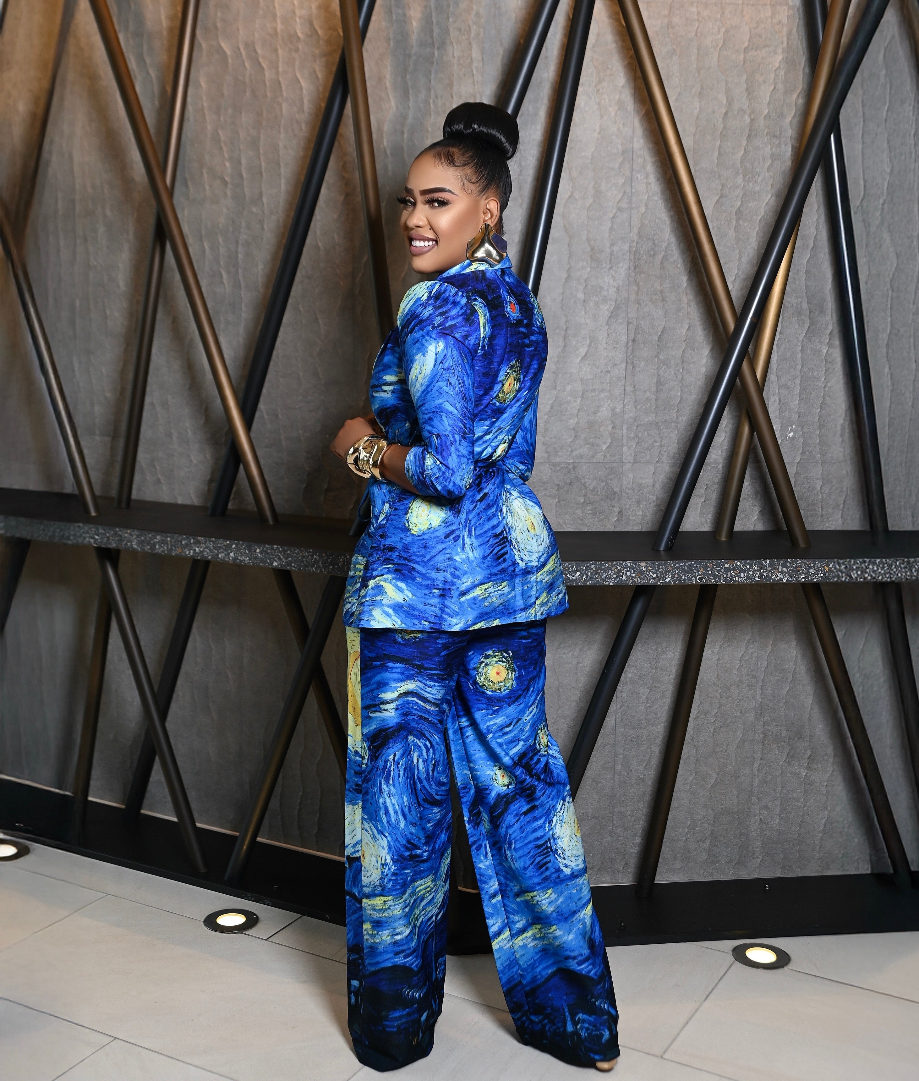 SET - BLAZER + PANT SET - CLASSIC PAINTING PRINT WOVEN FABRIC - BELT LOOPS WITH SASH BELT - PADDED SHOULDERS - NOTCHED, LAPEL COLLAR - LONG SLEEVES - HIGH-WAIST, WIDE-LEG PANT FIT - BACK ZIPPER CLOSURE