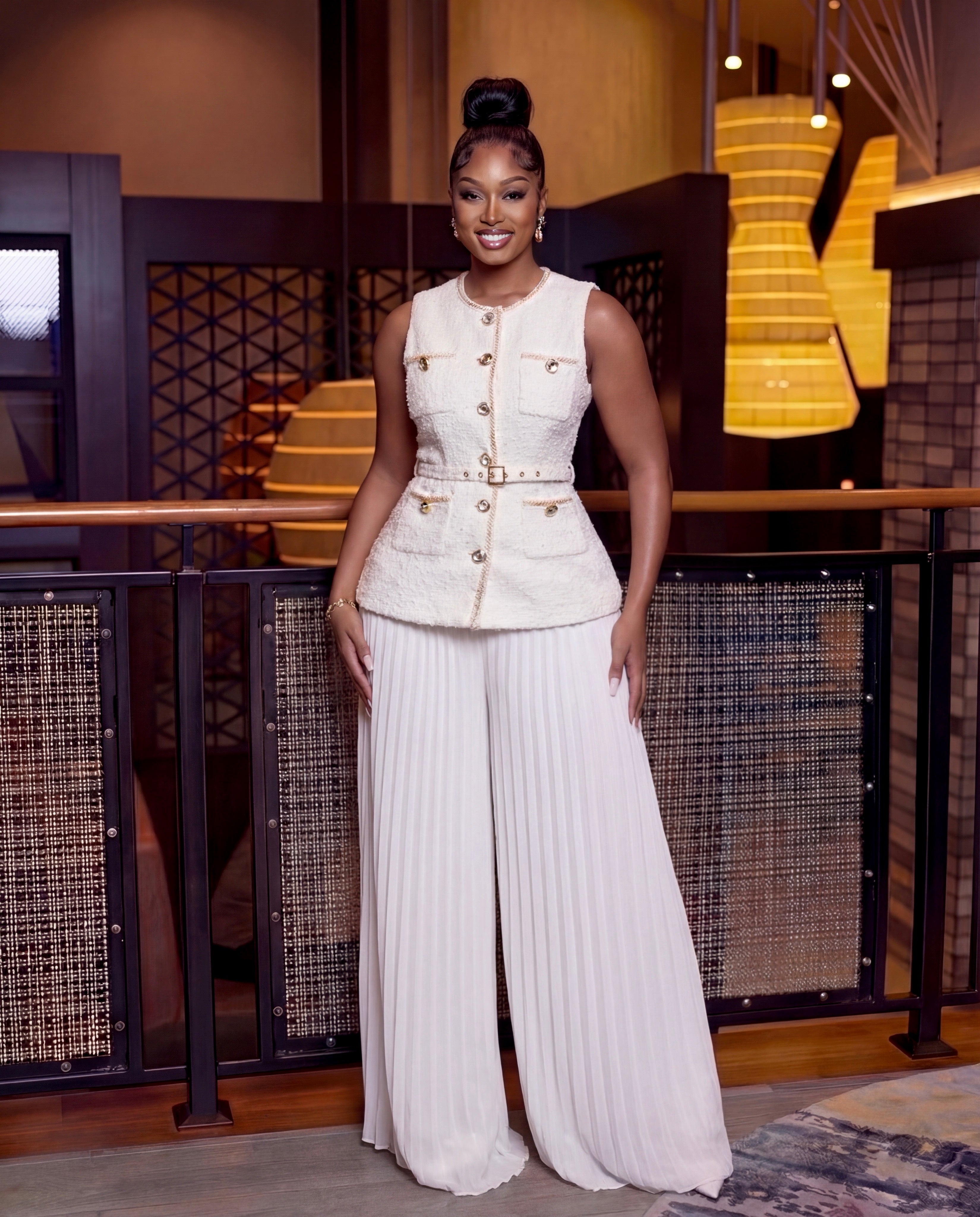 SET - TOP AND PANT SET - SOFT TWEED FABRIC - CRUSHED PEARL & GOLD FUNCTIONAL BUTTON - FAUX FLAP POCKET - BRAIDED TRIM DETAILING - BELT LOOPS + SQUARE BUCKLE THIN BELT - HIGH-WAIST, WIDE LEG PANT FIT - ACCORDION PLEATED - BACK ZIPPER CLOSURE