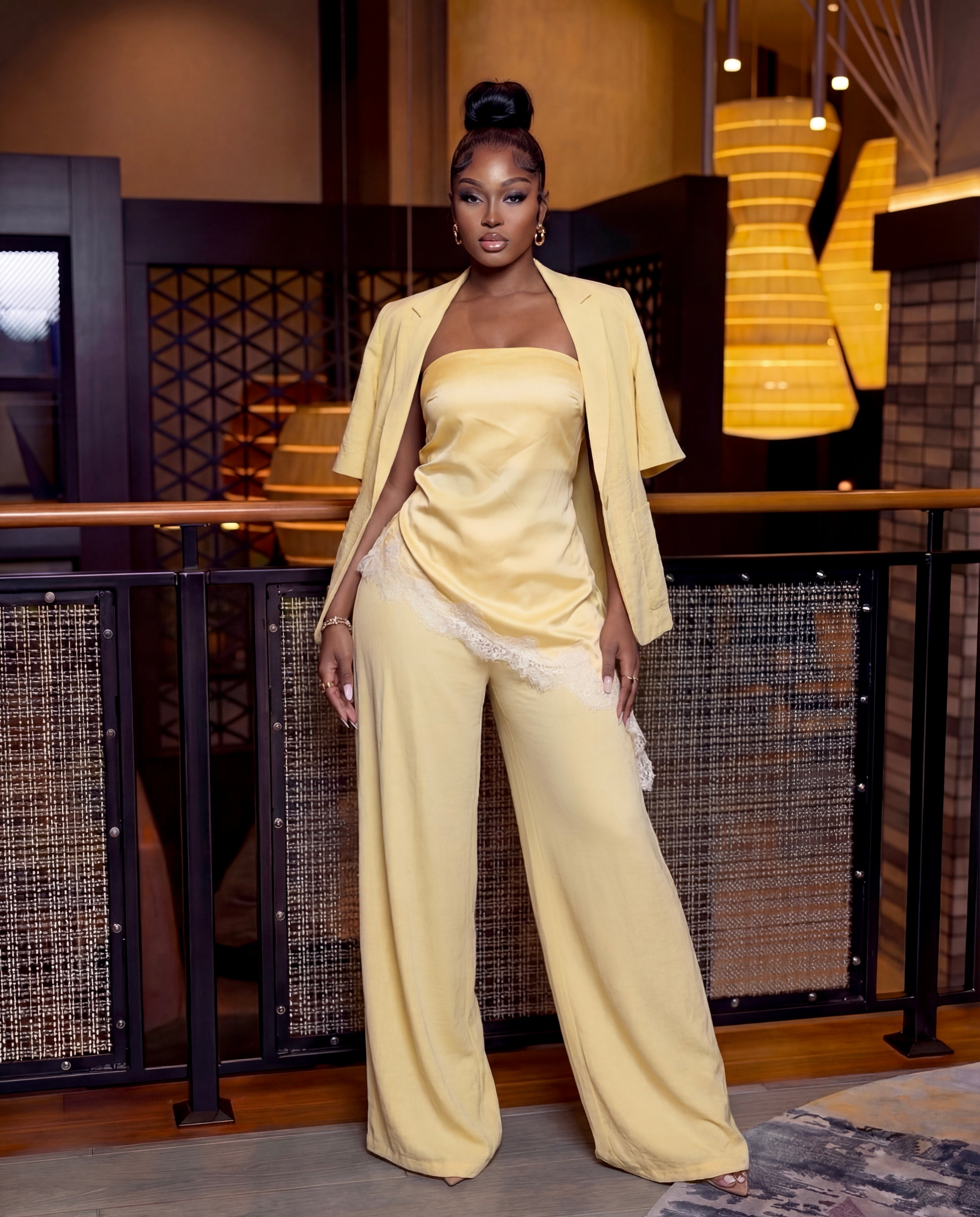 High-waisted wide leg pants - Concealed zip, and hook and eye closure - Soft pleated front detail - belt loops - Side pockets - Flowy, lightweight fabric - In-Lined *TOP* - Strapless satin top with straight neckline - Lace trim hem detail - Elastic back band for flexible fit - Smooth satin finish Blazer/jacket not included | Size + Fit | - Model is 5'8 and wearing size Small