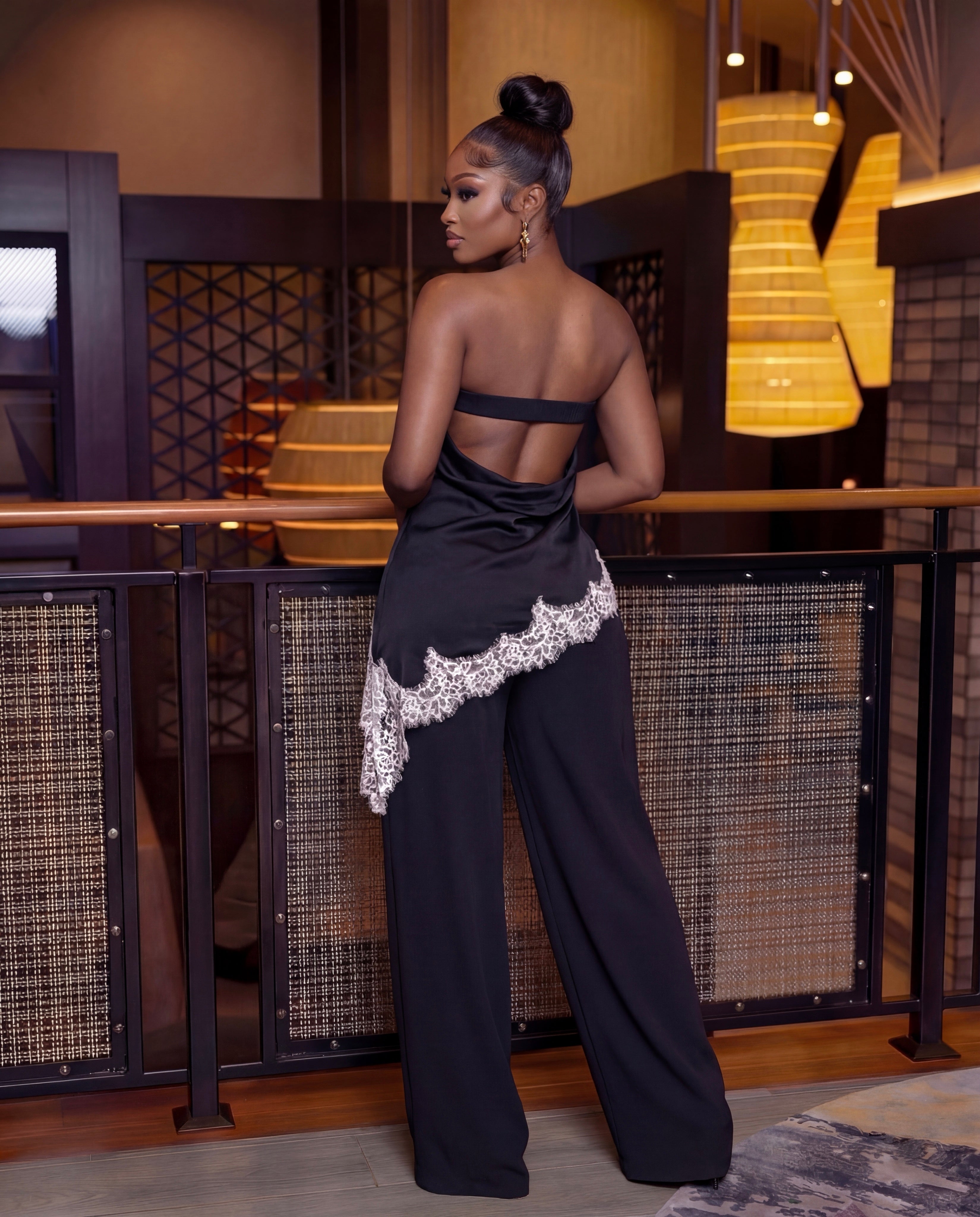 High-waisted wide leg pants - Concealed zip, and hook and eye closure - Soft pleated front detail - belt loops - Side pockets - Flowy, lightweight fabric - In-Lined *TOP* - Strapless satin top with straight neckline - Lace trim hem detail - Elastic back band for flexible fit - Smooth satin finish Blazer/jacket not included | Size + Fit | - Model is 5'8 and wearing size Small