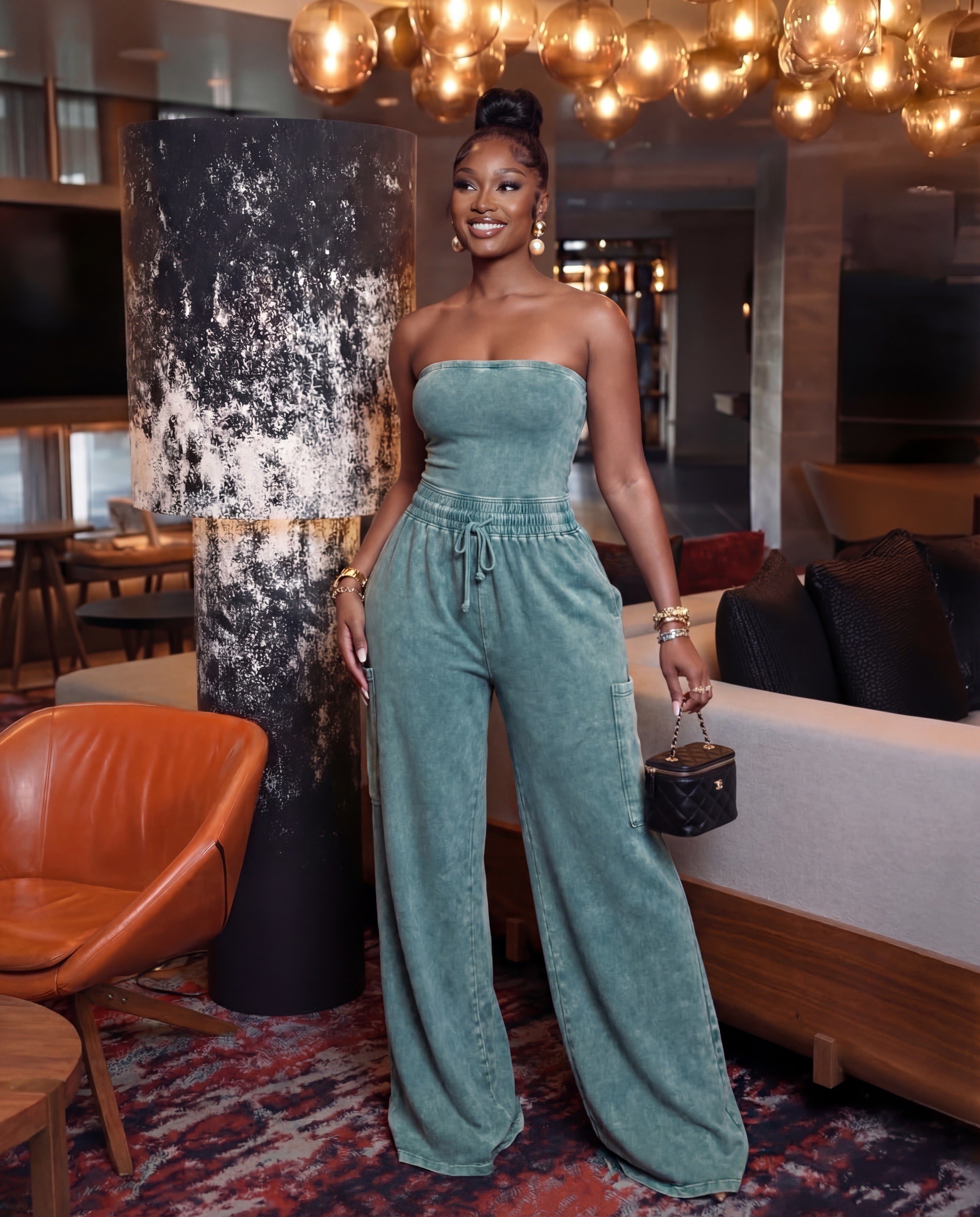 This strapless wide-leg jumpsuit features a mineral washed finish on soft cotton span for comfort and style. Designed with a drawstring elasticated waist and large patch pockets to enhance functionality. Elevate your look by pairing it with a statement belt and platform sandals for an effortlessly chic outfit. 95% Cotton 5% Spandex Model is Wearing A Size Small Imported. Designed In The USA