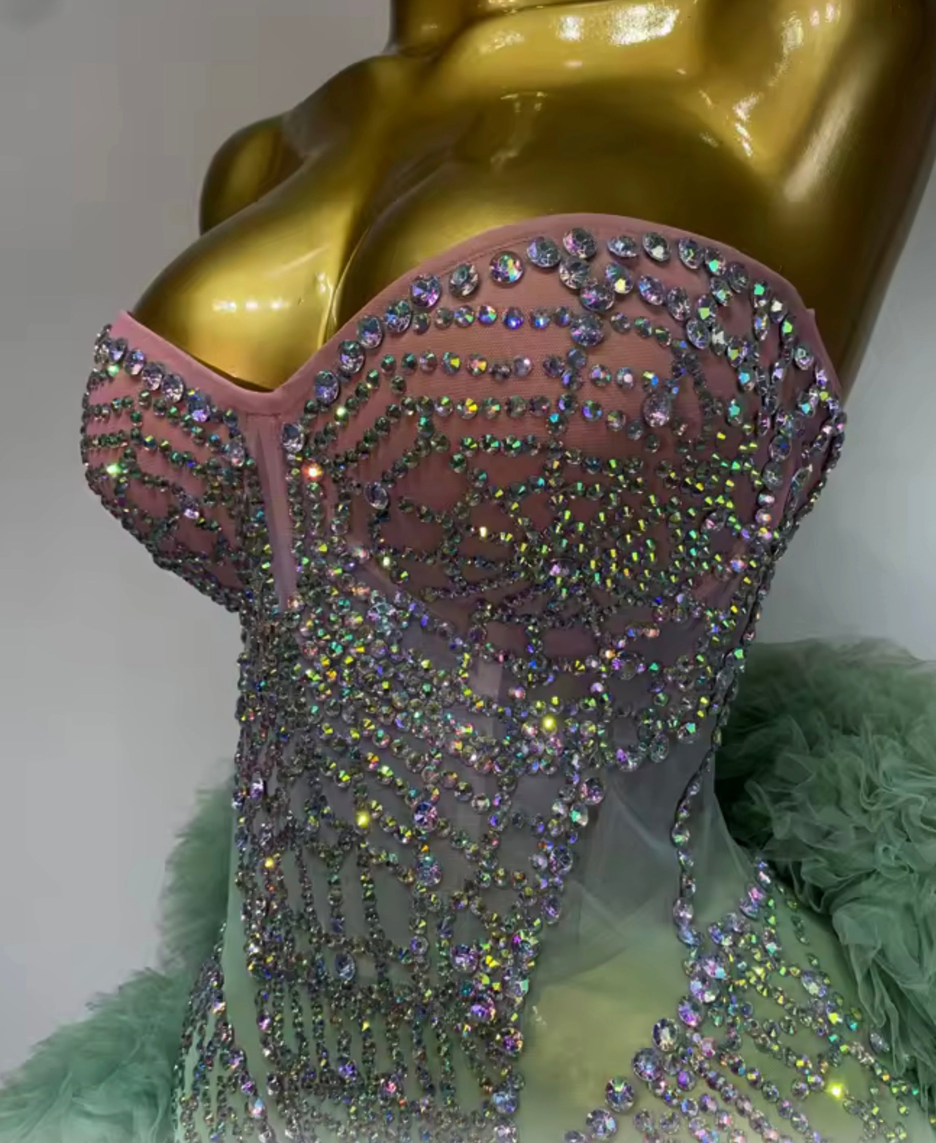 A couture showpiece designed to sculpt, sparkle, and steal the spotlight. The Mint Corset Mini Dress features a structured strapless corset bodice crafted on a nude stretch illusion mesh base, fully hand-embellished with iridescent crystals in an intricate, body-contouring pattern.
