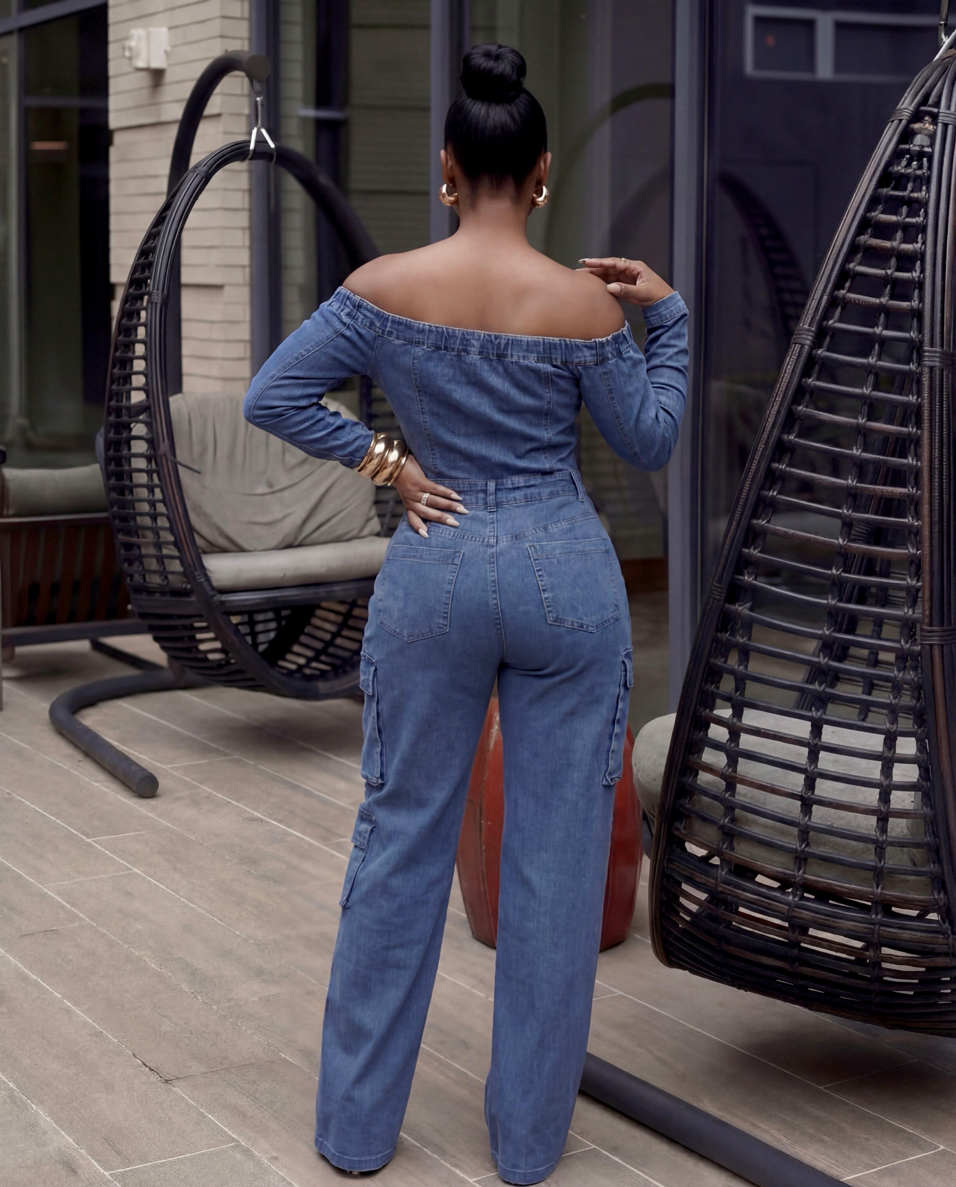 LONG SLEEVE OFF SHOULDER BUTTON UP POCKETS WIDE LEG DENIM JUMPSUIT 80% Cotton 20% Polyester. Hand Wash.
